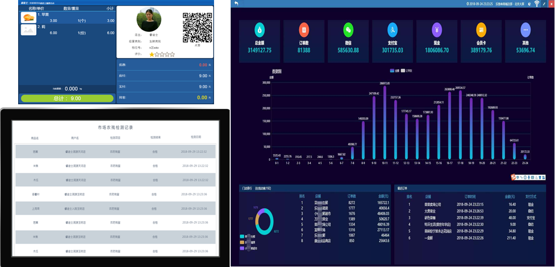 在智能農(nóng)貿(mào)溯源收銀秤上集成:觸摸、圖片展示、稱重、交易顯示、收銀、會(huì)員、移動(dòng)支付、IC卡支付,通過智能設(shè)備的應(yīng)用提供便捷的購物方式。對(duì)市場信息數(shù)據(jù)庫(進(jìn)貨量、交易額)進(jìn)行綜合挖掘分析,形成市場大數(shù)據(jù)。通過對(duì)數(shù)據(jù)信息的應(yīng)用,動(dòng)態(tài)掌握市場經(jīng)營狀況,為經(jīng)營決策、調(diào)控預(yù)警提供數(shù)據(jù)支撐,形成新型市場管理經(jīng)營模式。